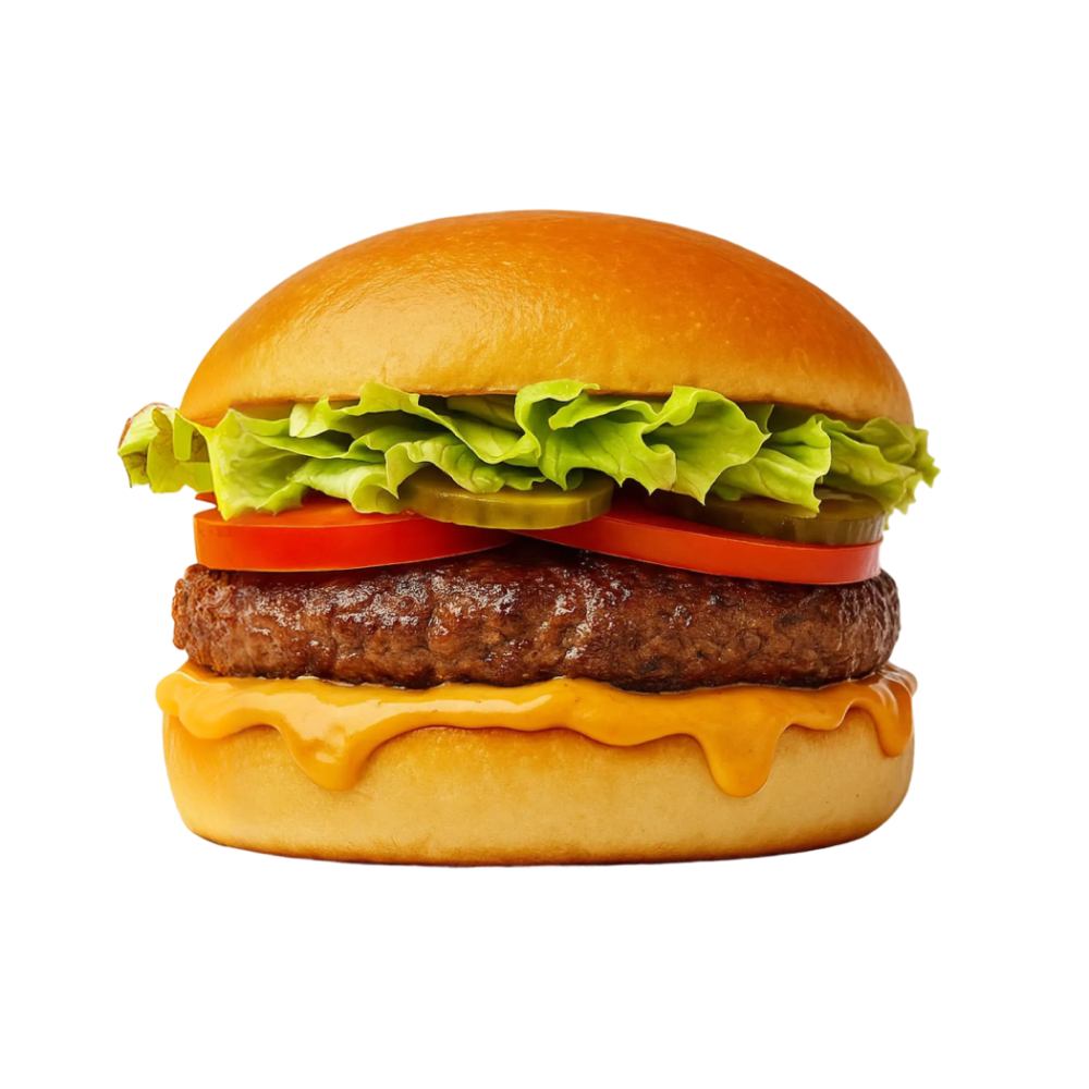 Булочка фирменная, котлета говяжья, огурец соленый, томат, салат айсберг, соус бургер.