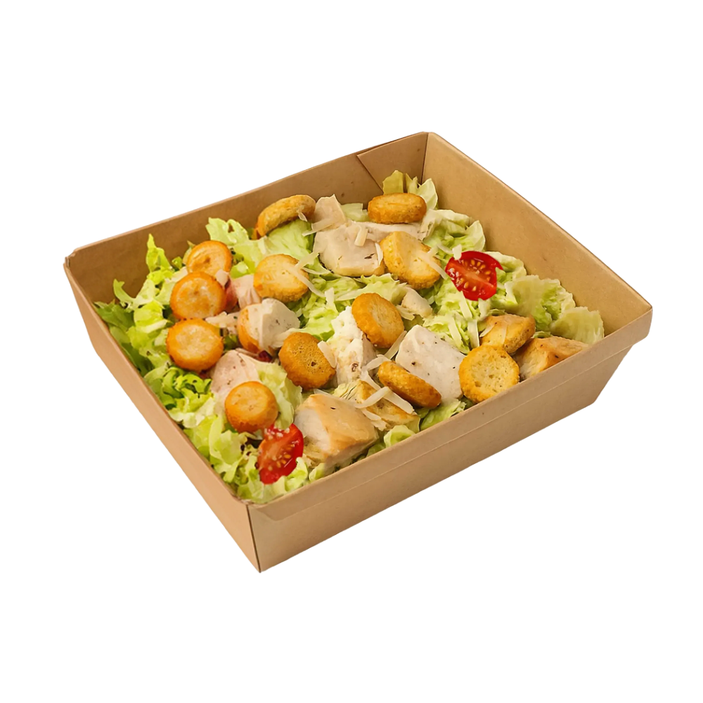 Курица, томат, салат айсберг, сыр, сухарики, соус цезарь.