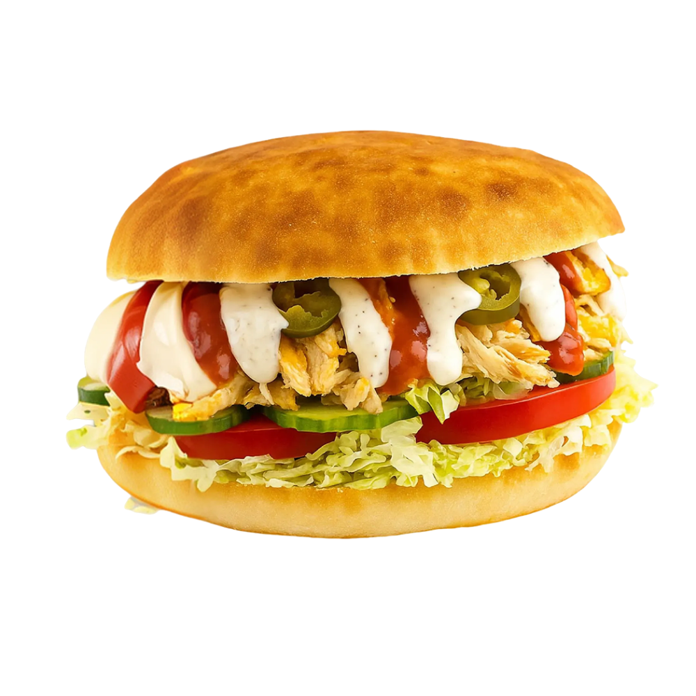 Пита, курица, капуста, огурец соленый, томат, перец болгарский, перец халапеньо, соус фирменный чесночный, соус шрирачи.