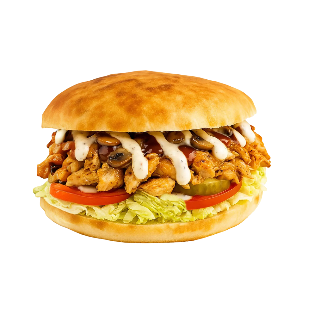 Пита, курица, капуста, грибы, огурец соленый, томат, соус фирменный чесночный, соус грибной.