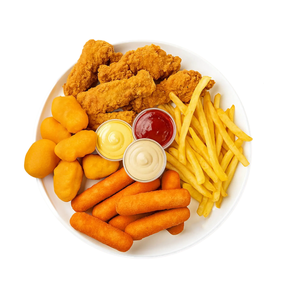 Палочки сырные, картофель фри, наггетсы, крылья куриные, кетчуп, соус сырный, соус гриль.
