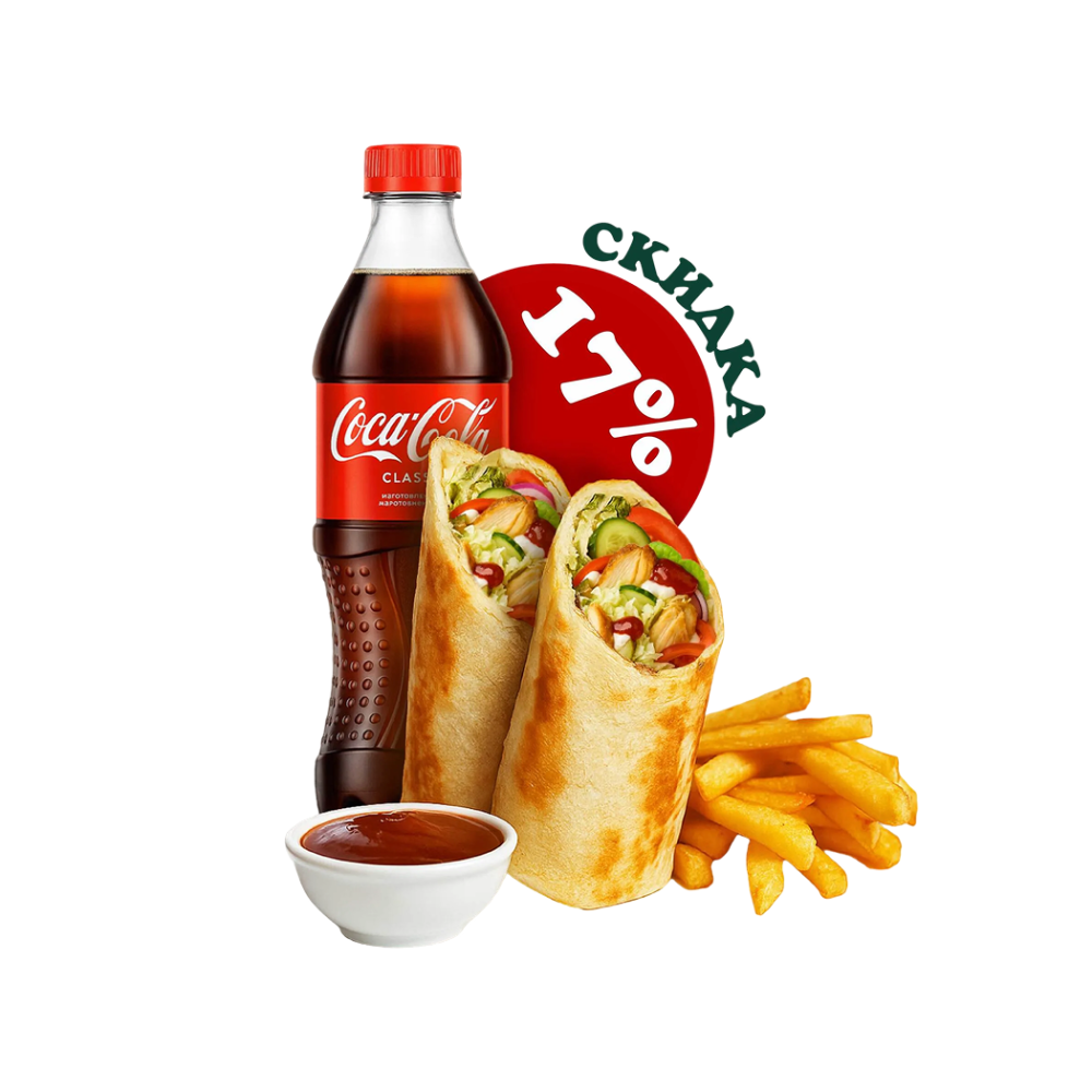 Донер классический, картофель фри, кока-кола с сахаром / без сахара, соус на выбор.
