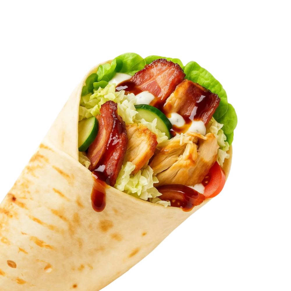 Лепешка арабская, курица, бекон, капуста, огурец свежий, томат, соус фирменный чесночный, соус терияки.