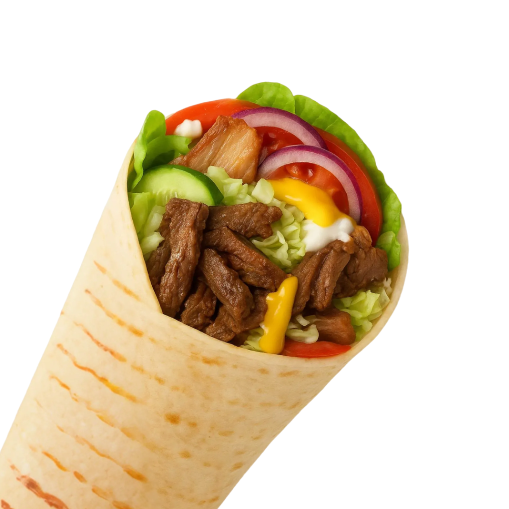 Лепешка арабская, говядина, капуста, огурец свежий, томат, лук красный, соус фирменный чесночный, соус тейсти.