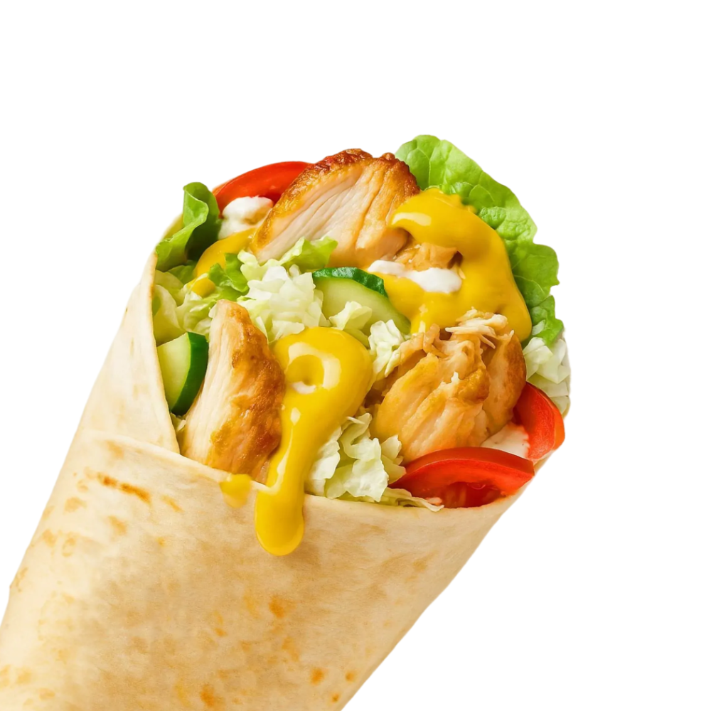Лепешка арабская, курица, капуста, огурец соленый, томат, соус фирменный чесночный, горчица американская.