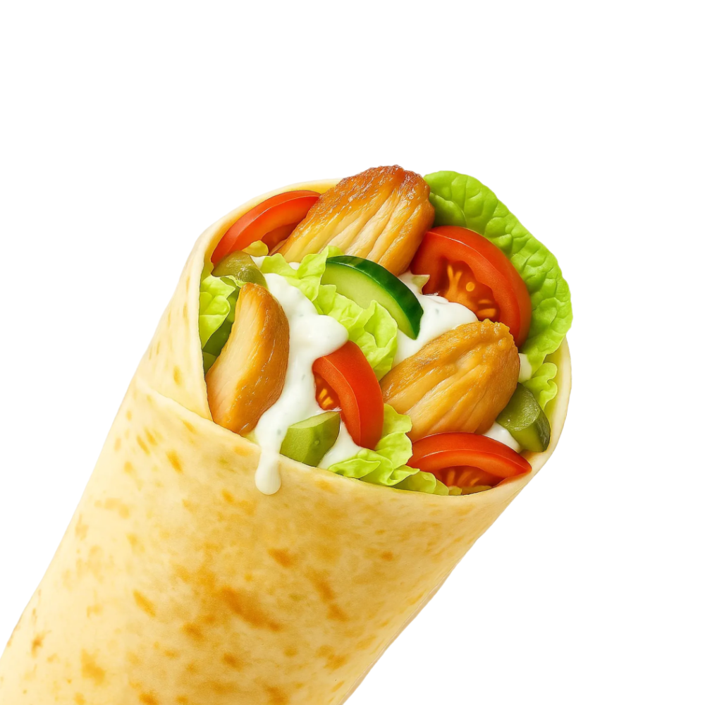 Лепешка арабская, курица, капуста, огурец свежий, огурец соленый, томат, соус фирменный чесночный.