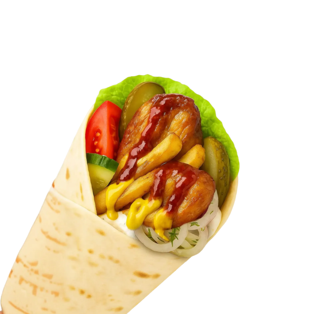 Лепешка арабская, курица, картофель фри, огурец соленый, огурец свежий, томат, лук маринованный, соус фирменный чесночный, горчица американская.